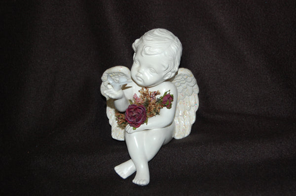 A-1661 - White Pearly Ceramic Angel holding a Dove and bouquet of flowers